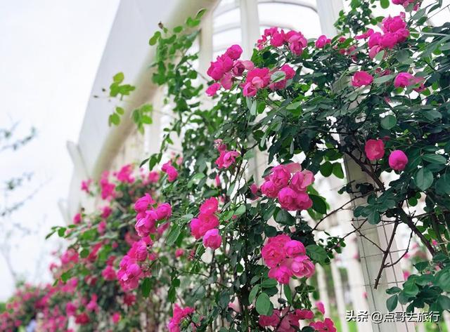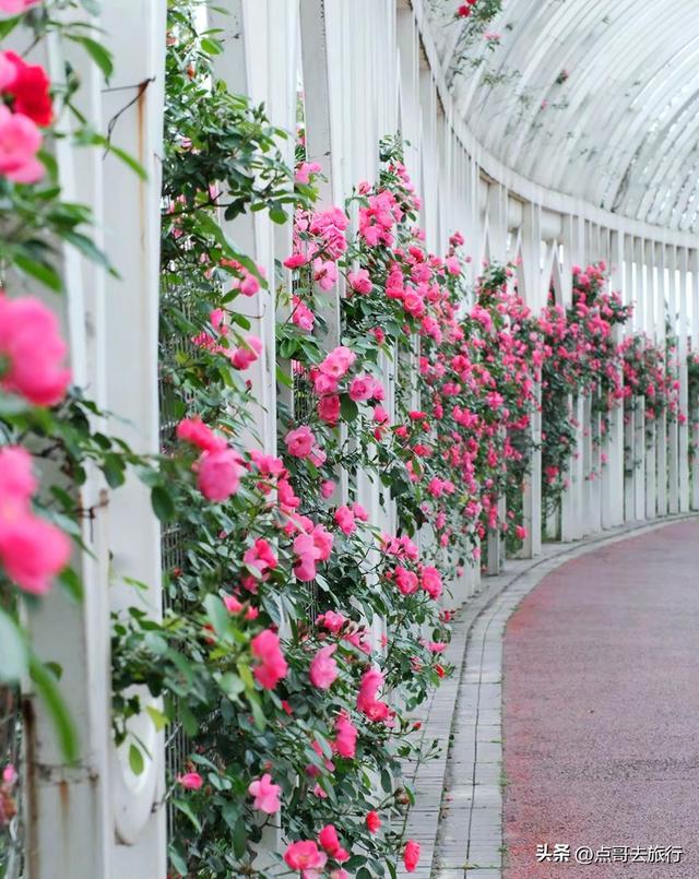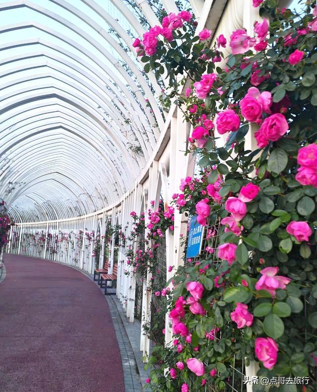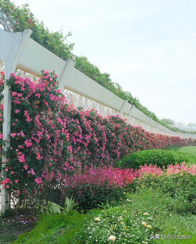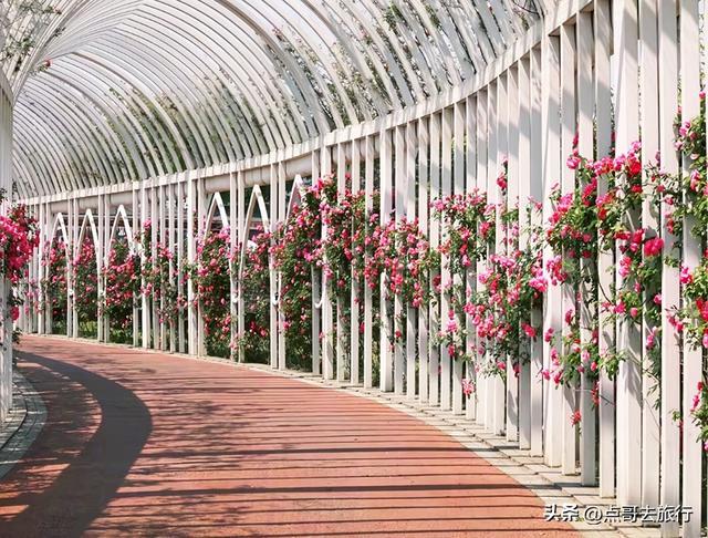 这里,我前些天给大家提过,当时花还没有大量盛开,今天再去,与上次的景象已截然不同。100多米的月季花长廊,内侧和外侧都开满花朵,花朵颜色多样,与2米多高的白色廊架交相映衬,浪漫得一塌糊涂。在此赏花的人,除了感叹美,还是美。长廊呈弧形延伸,S弯道纵深感超强。这里毗邻双流国际机场,花廊下可清晰观看飞机起降,低空掠过的飞机与绚烂月季花同框,这是独一份的体验。这里最具吸引力的,不仅仅是花美,还有游人稀少,可以尽情拍照赏花,不用担心被人群遮挡或催促。现在正是盛花期。
