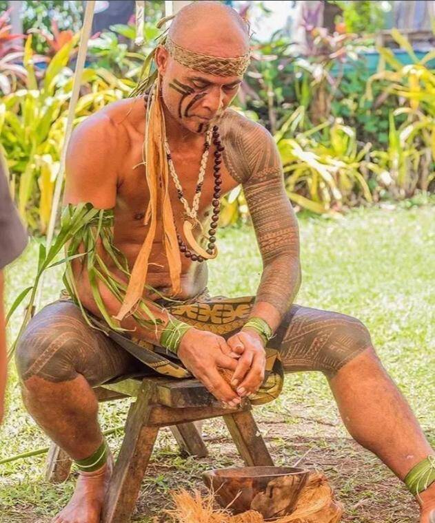 纹身的时候,师傅会用鲨鱼牙或猪牙制成的手工敲针,把烧过的贝壳和椰壳灰当成天然墨水,一点点往皮肉里面硬塞,直到皮肉被染成无法去除的灰黑色。