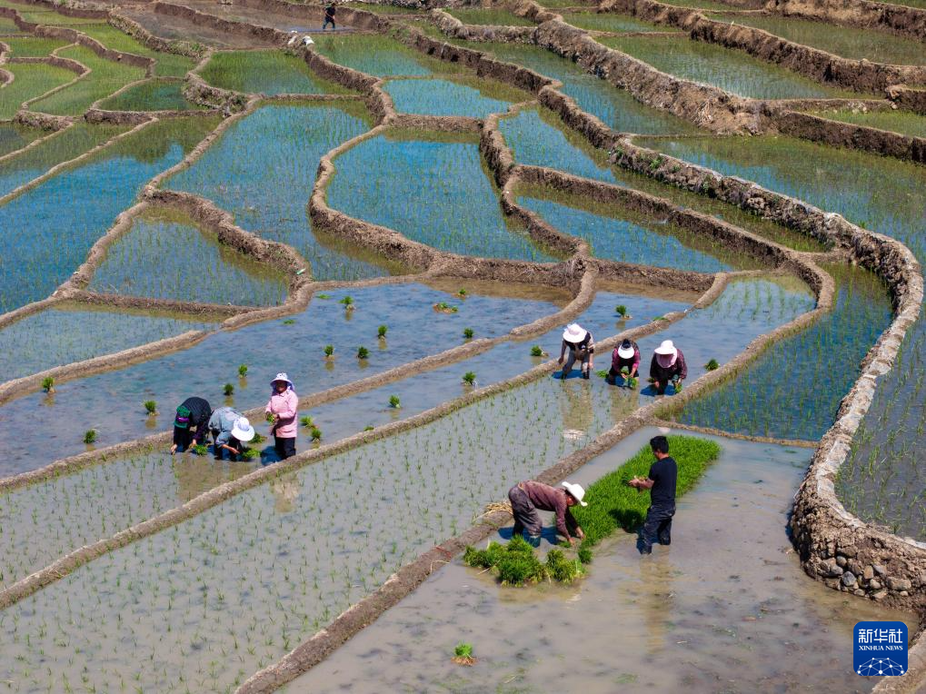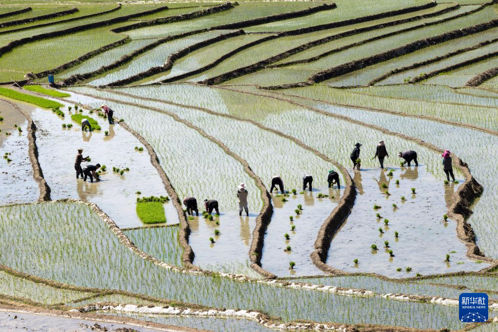 目前,四川省凉山彝族自治州甘洛县普昌梯田进入农忙时节。村民们在如镜映天的田里忙着插秧、劳作。