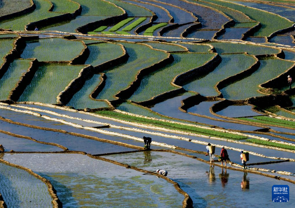 4月18日,村民在梯田上插秧。
