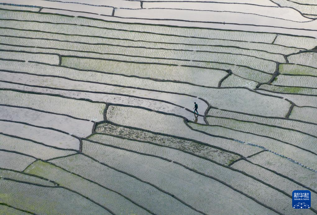 4月18日,村民在梯田上巡田(无人机照片)。